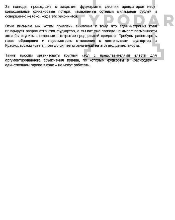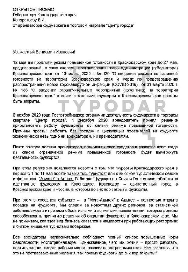 Владельцы общепитов в «Фудмаркете» в середине мая обратились к губернатору Вениамину Кондратьеву с просьбой объяснить, почему в Краснодаре до сих пор не открыли фудкорты